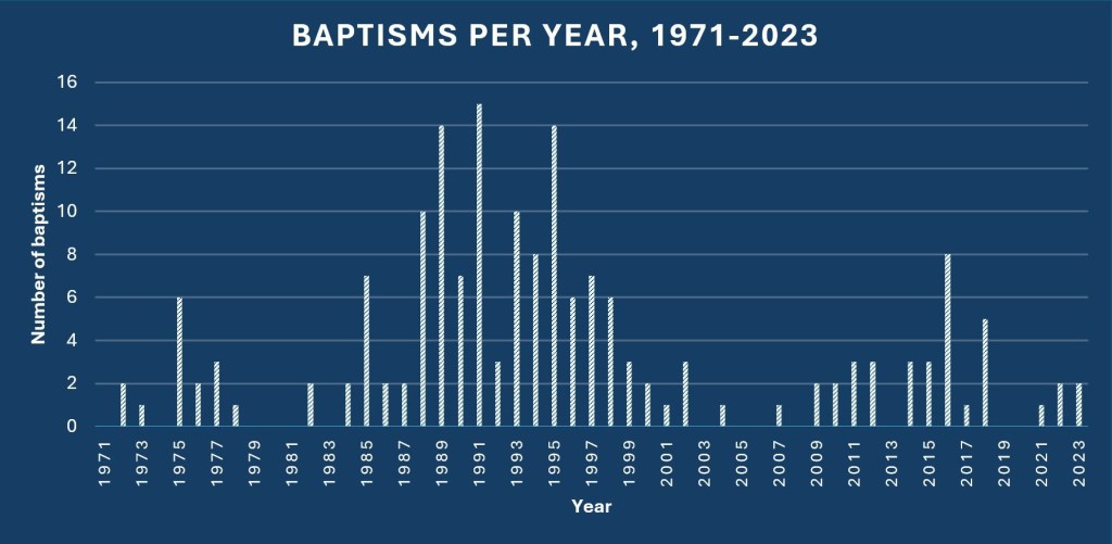 The Witnesses had managed in the space of a few decades to entrench themselves in all of Greenland’s major population centres and become a regular feature of the island’s news cycle, but their momentum has dissipated considerably in the twenty-first century. This is reflected mainly in baptism numbers, which remain stagnant in the low single digits (at best), and in the reduction in the number of congregations from 7 to 6 in 2008,53 and then down to 5 in 2017.54 The ratio of publishers to citizens in the country peaked at 1 to 331 in 2017 (see graph below) but this was achieved mainly through migration rather than conversion.